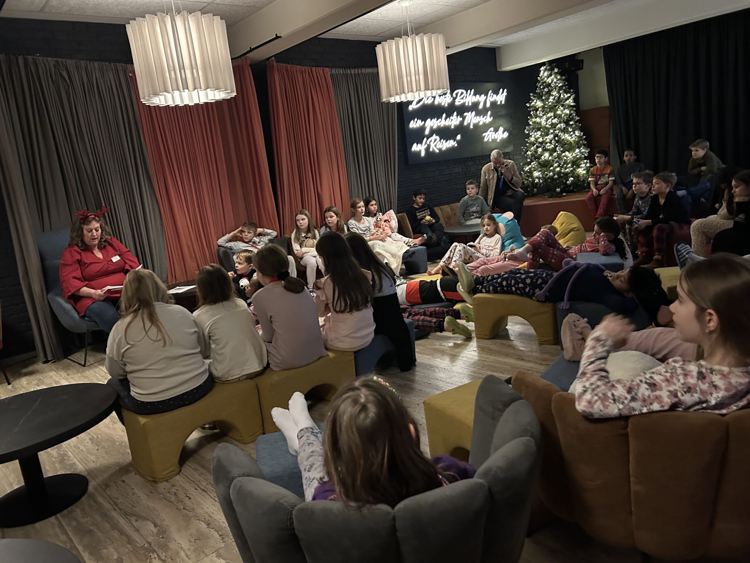 Nach dem Abendessen war aber noch lange nicht Schluss: Wir gingen auf eine spannende Nachtwanderung und danach wurde in der Disco fleißig getanzt. Zum Schluss gab es noch eine gemütliche Gute-Nacht-Geschichte im Kaminzimmer– ein besonders schöner Abschluss des Tages!